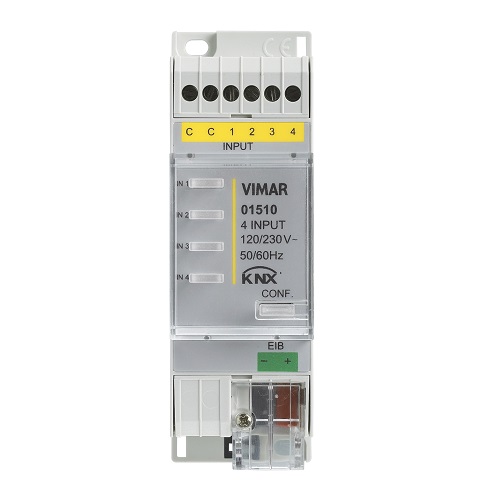 VIMAR 01510 - Modulo KNX a 4 ingressi digitali 120-230 V~ programmabili per funzionare come contatti normalmente aperti ( NO ) , o normalmente chiusi ( NC ) . Standard Konnex , installazione su guida DIN dove occupa 2 moduli DIN
