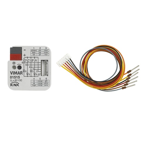 VIMAR 01515 - Dispositivo di interfaccia KNX con 4 canali che possono essere configurati , tramite il software ETS , come ingressi digitali o uscite digitali. Ideali per interfacciare comandi tradizionali , led di stato o contatti a potenziale zero. Il collegamento è ideale grazie agli spinotti di 30 cm già compresi e alla possibilità di installazione ad incasso .