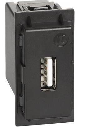 Caricatore USB Bticino serie Living Now tipo A con tensione 5 Vd.c. per la sola ricarica di dispositivi elettronici fino a 1.100 mA. Alimentazione DIRETTA 110-230 V, 50-60 Hz.